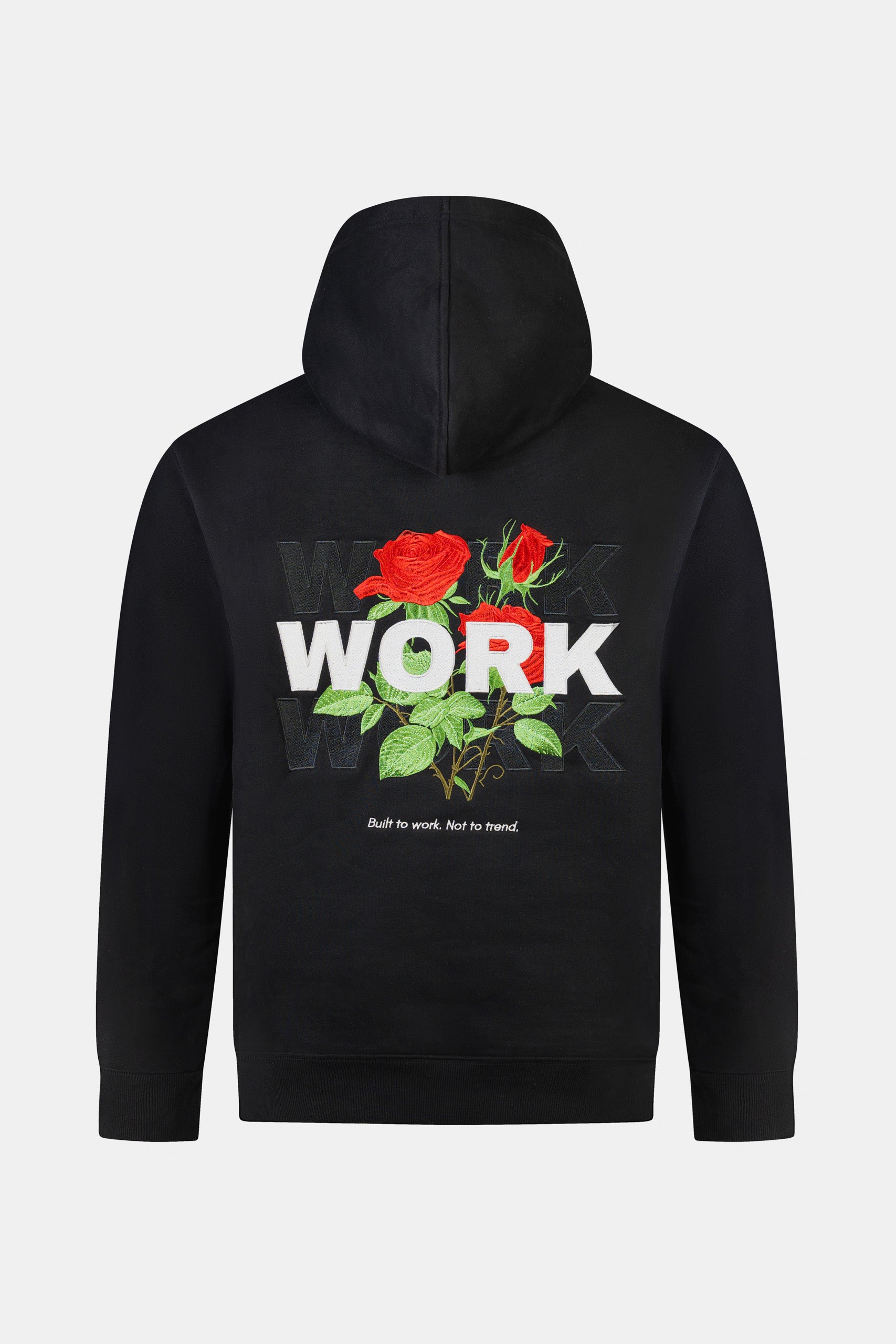 Wat deze hoodie uniek maakt: de volledige achterkant is rijkelijk geborduurd met rode rozen en de tekst WORK WORK WORK – krachtig gecombineerd met de slogan “Built to work. Not to trend.”