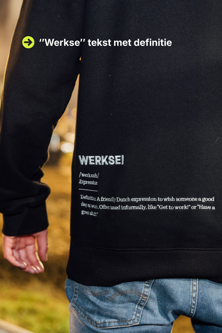 Auf der Brust steht „Werkse!“ – ein typisch niederländischer Ausdruck, den man jemandem mitgibt, wenn er zur Arbeit geht. Locker übersetzt bedeutet es: „Pack’s an“ oder „Gute Schicht“. Ein Augenzwinkern ans tägliche Malochen und gleichzeitig ein Tribute an die Männer, die den Laden am Laufen halten.