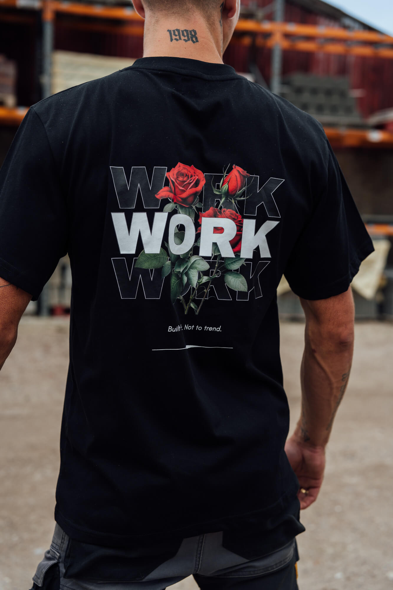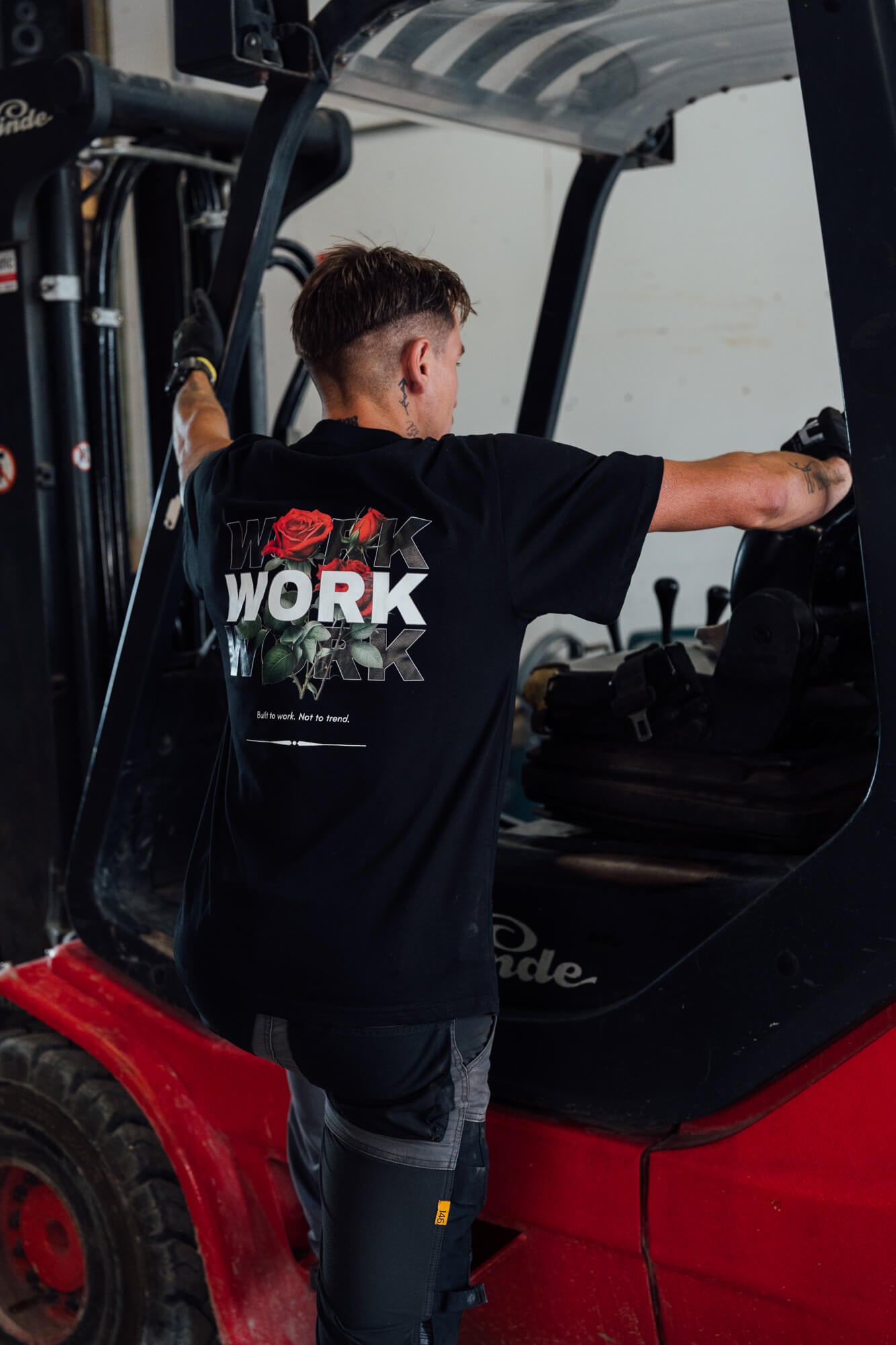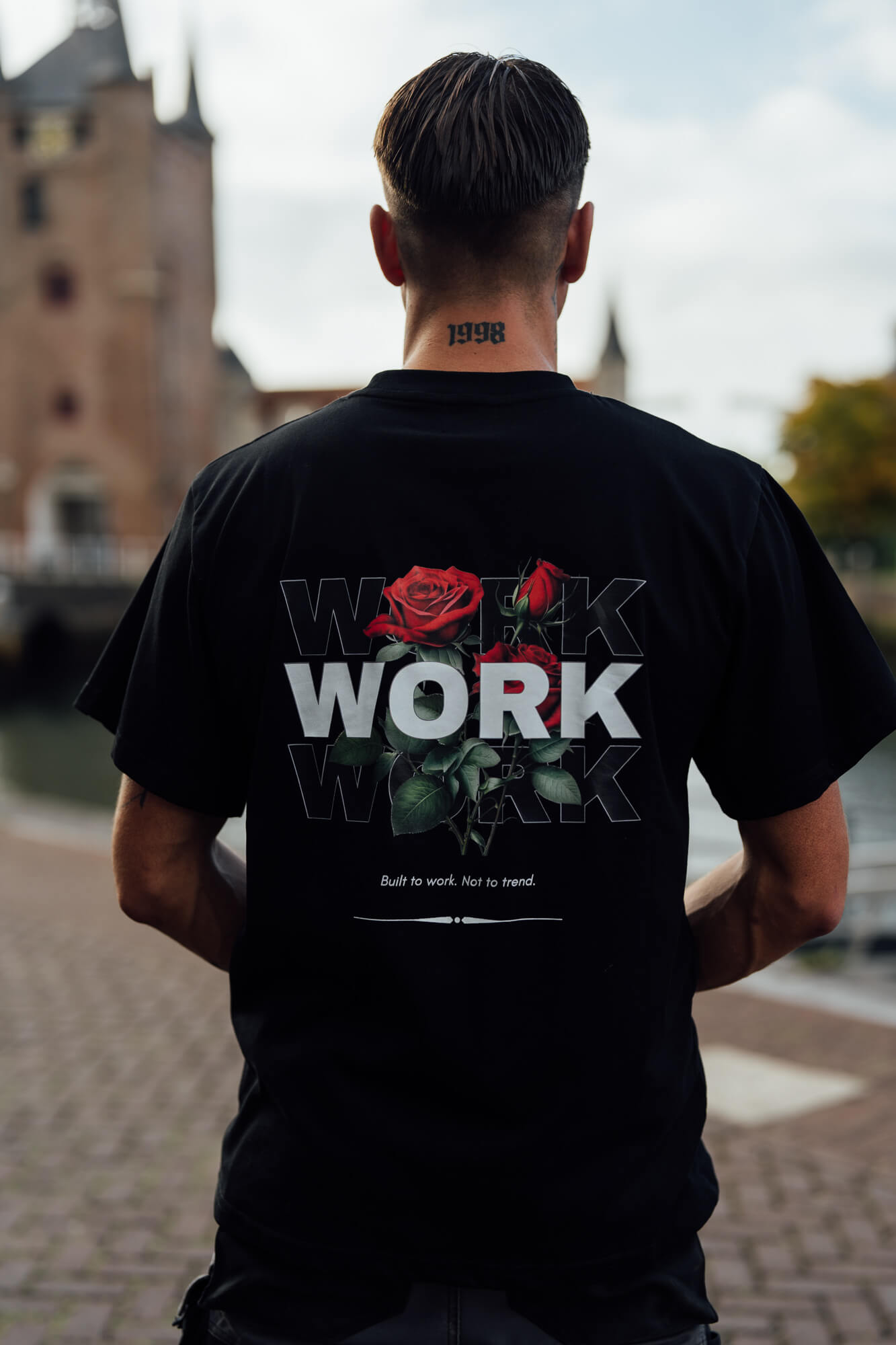 Travailler n’est pas une tendance, c’est un état d’esprit. Le T-shirt Dr. Worker WORK WORK WORK le montre parfaitement. Avec son imprimé dos frappant – trois fois WORK combiné à des roses rouges – ce t-shirt fait une déclaration : Built to work. Not to trend.