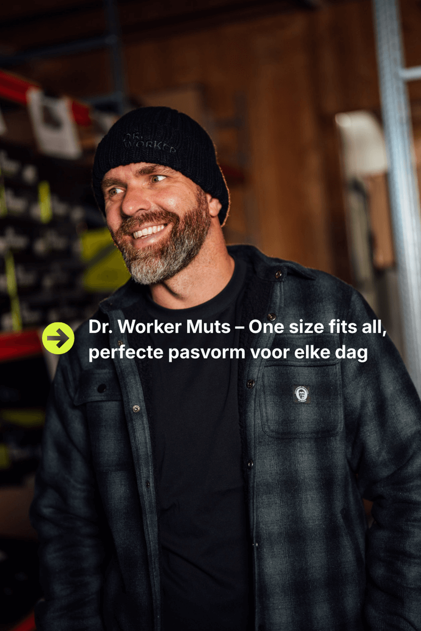 De klassieker onder de werkmutsen. Grofgebreid, warm en afgewerkt met een subtiel zwart-op-zwart DR. WORKER borduursel. Gemaakt van 100% acryl, soepel maar stevig, blijft goed zitten — ook na een lange dag op de job. One size fits all. Geschikt voor werk én vrije dagen.