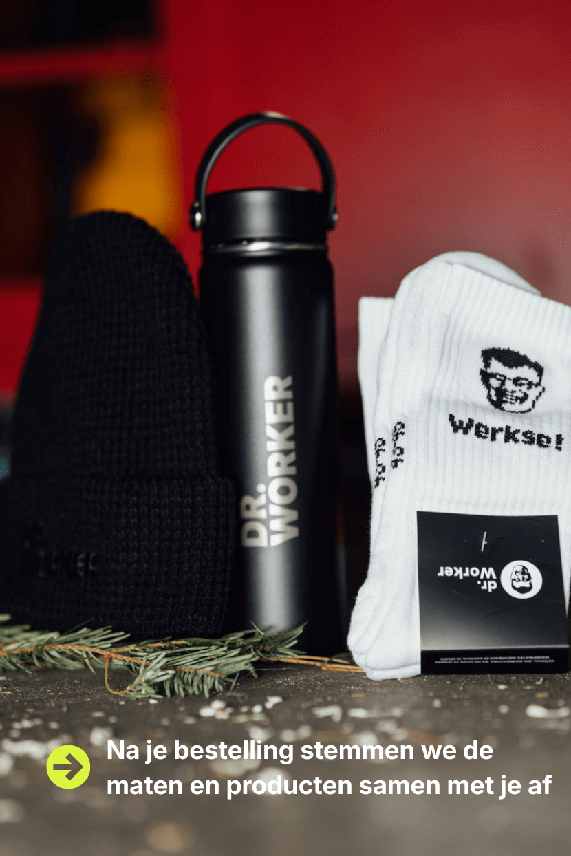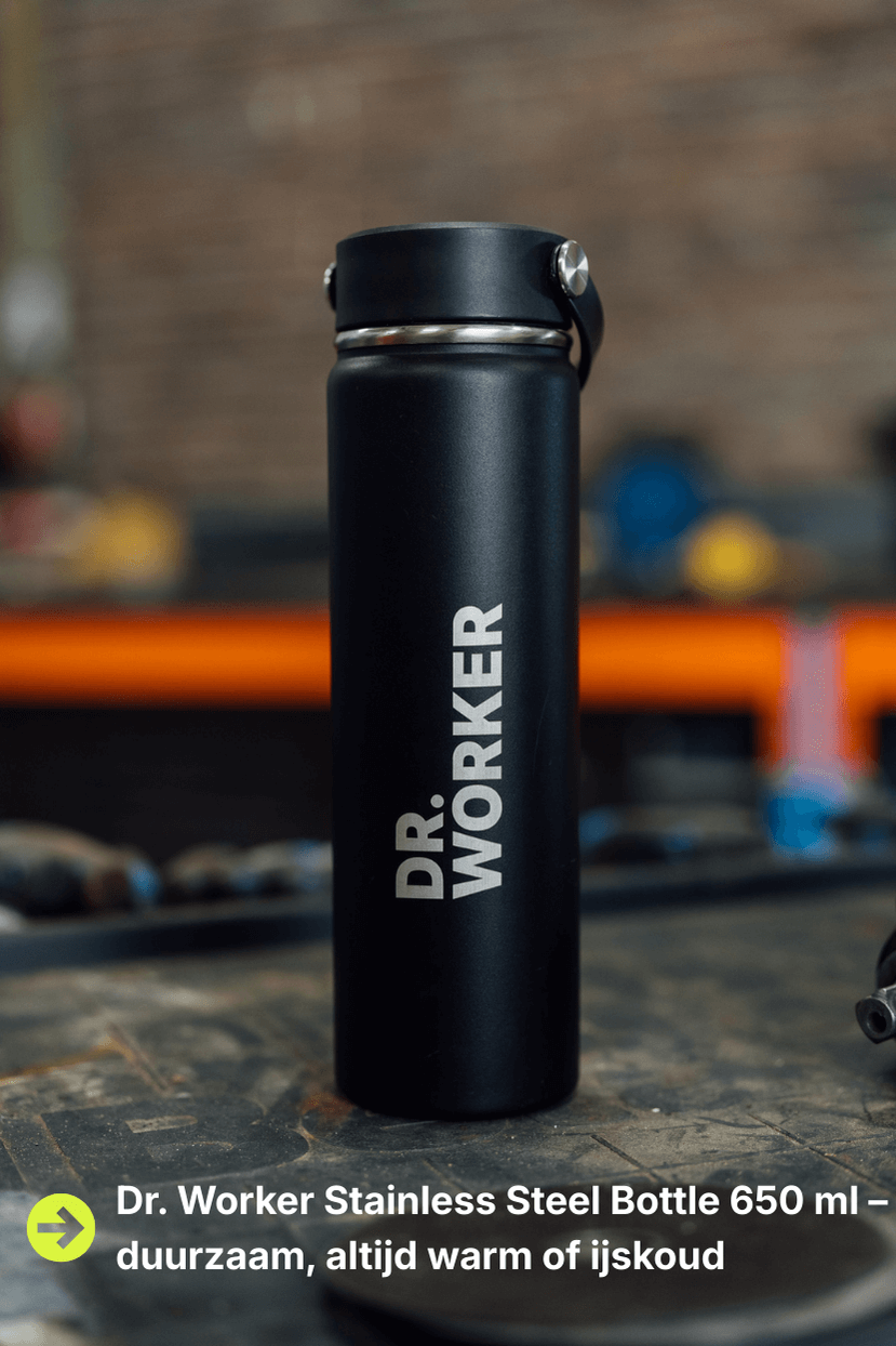 Houdt je water koud en je koffie heet — waar het werk je ook brengt. Gemaakt van 304 roestvrij staal met een BPA-vrije dop en food-grade siliconen afdichting. Geen lekkage, geen nare smaken. De matzwarte afwerking met subtiel Dr. Worker-logo maakt ’m strak en functioneel tegelijk. Geen poespas. Geen plastic rommel. Gewoon een fles die doet wat hij moet doen — elke dag opnieuw.